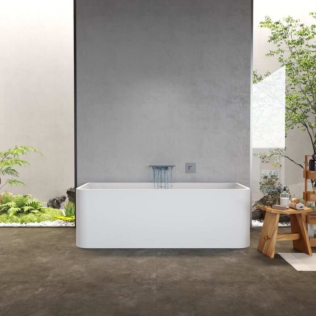 The bathtub is made from modified acrylic solid surface, a material widely used in premium bathroom products. It combines strength, durability, and a refined texture.